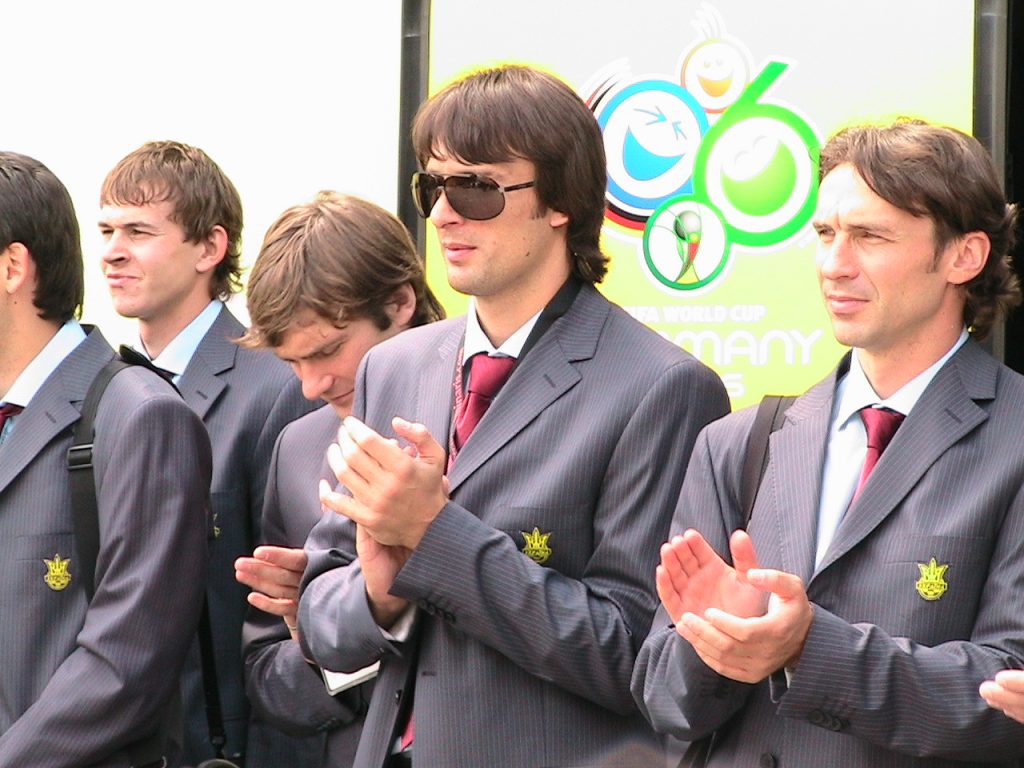 Українська збірна на чолі з строгим тренером Блохіним. Їх так гарно урочисто вітали, але він був невдоволений (весь час бурчав,що хлопці з дороги і треба відпочить) а тут так довго балакають.