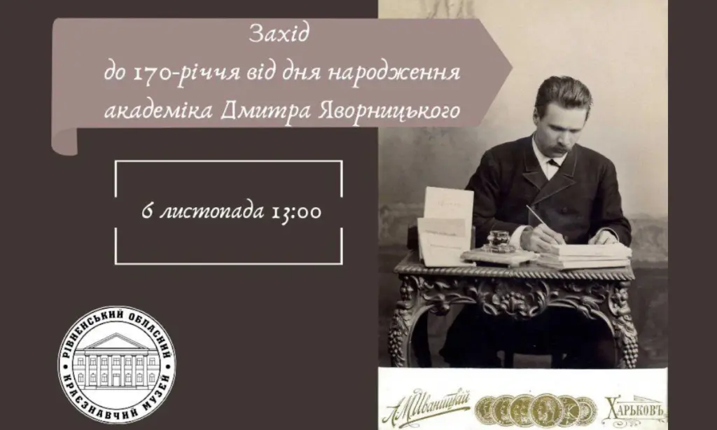 6 листопада о 13:00 у Рівненському обласному краєзнавчому музеї відбудеться захід, присвячений 170-річчю з дня народження академіка Дмитра Яворницького – видатного українського історика, археолога, етнографа, фольклориста та музейника.