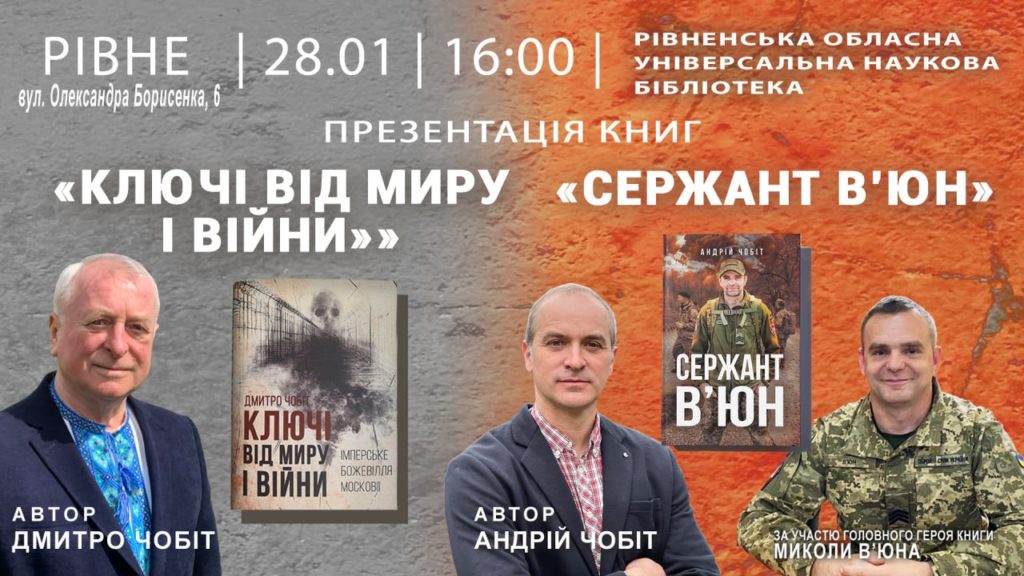 Андрій Чобіт «Сержант В’юн», Дмитро Чобіт «Ключі від миру і війни». Презентація книг авторів Андрія та Дмитра Чобіт відбудеться у Рівненській обласній універсальній науковій бібліотеці. На зустрічі буде присутній реальний герой книги.