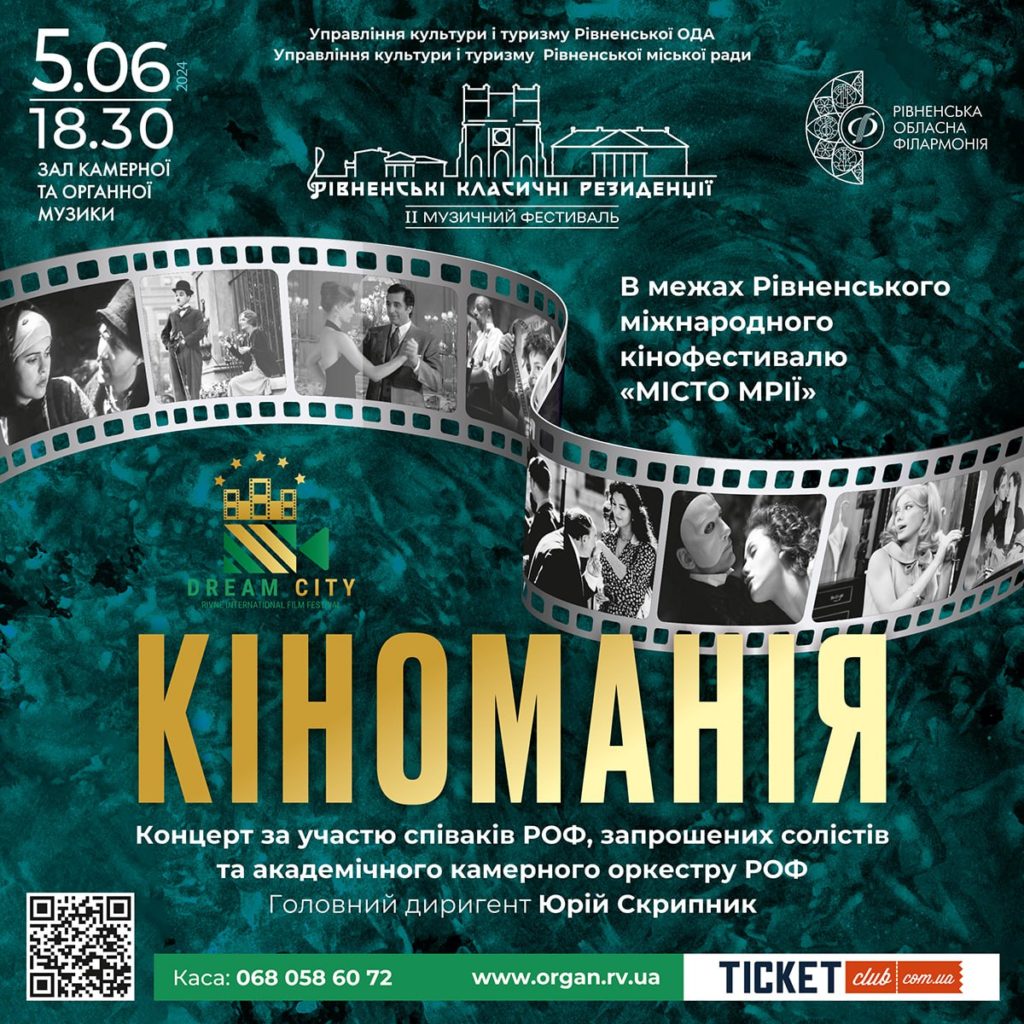 Кіноманія в рамках міжнародного Рівненського фестивалю “Місто мрій”. В середу, 5 червня о 18:30 шедеври кіномузики звучатимуть у виконанні Інни Бобомуратової, Анни Прядко, Павла Мищука, Тетяни Батейко та академічного камерного оркестру РОФ, головний диригент Юрій Скрипник.