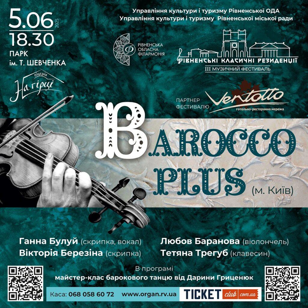 BAROCCOPLUS об’єднує відомих українських виконавиць: Ганну Булуй (скрипка, клавесин, вокал), Вікторію Березіну (скрипка), Любов Баранову (віолончель) та Тетяну Трегуб (клавесин, блокфлейта). Програма включатиме твори композиторів раннього бароко — Клаудіо Монтеверді, Тарквініо Мерули, Генрі Персела, Міхаеля Преторіуса, Антоніо Вівальді та Антоніо Кальдари.