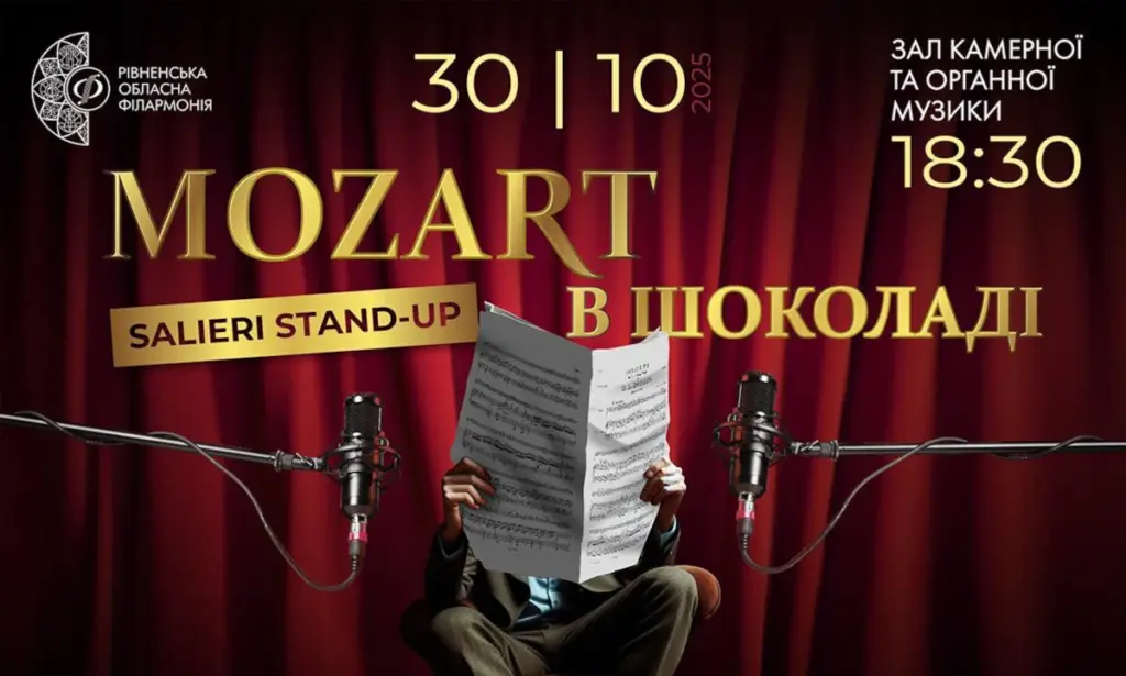 30 жовтня о 18:30 Рівненська обласна філармонія запрошує на прем’єру, яка обіцяє змінити ваше уявлення про класику. SALIERI STAND-UP “Моцарт у шоколаді” – це подія, де історія оживає з іронією, музикою і справжнім гумором.
