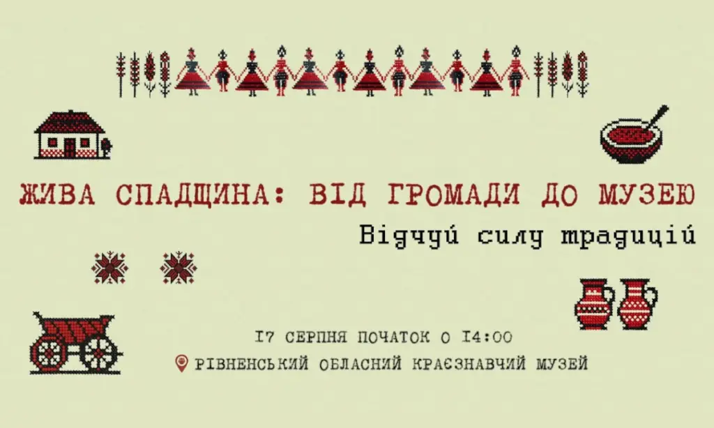 17 серпня о 14:00 подвір’я Рівненського обласного краєзнавчого музею перетвориться на осередок народної культури, музики, ремесел та смачних частувань. Тут відбудеться традиційний культурний захід «Жива спадщина: від громади до музею», який об’єднує людей і традиції Рівненщини, аби їх зберігати та передавати наступним поколінням.