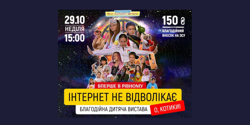 Рівненський академічний обласний театр ляльок запрошує гостей у неділю, 29 жовтня, о 15:00. Там відбудеться показ гостросоціального спектаклю «Інтернет не відволікає. О, котики!». Усі актори – діти Рівненської «Школа театрального мистецтва».