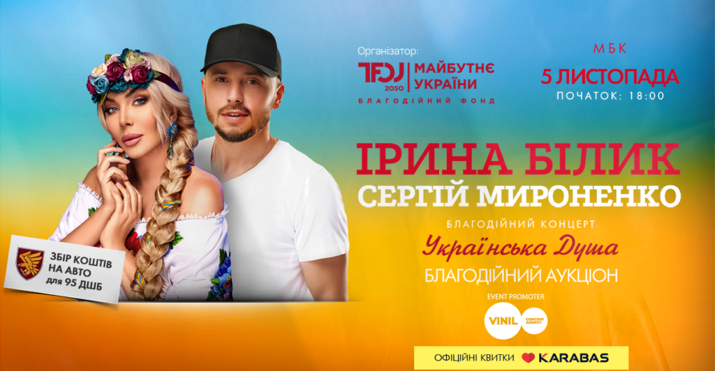 Цієї осені Благодійний Фонд «Майбутнє України 2050» оголошує Всеукраїнський Благодійний Тур. В ньому беруть за участь легендарна українська співачка, народна артистка України Ірина Білик та талановитий Сергій Мироненка. 5 листопада артисти виступлять у Міському будинку культури. Початок події о 17:00, повідомили промоутери події VINIL Concert agency.