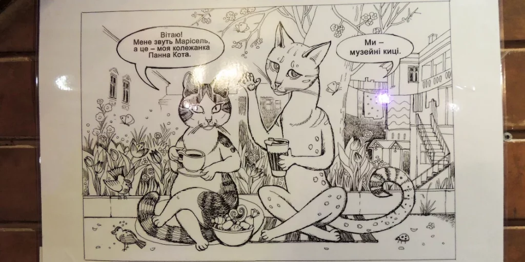 «Щоденник війни. Марісель і Панна Кота рятують культурну спадщину» – це графічна новела на підтримку музеїв та об’єктів культурної спадщини.
