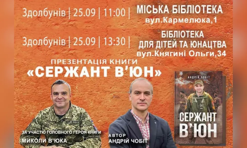 У Здолбунові 25 вересня 2025 року відбудеться презентація книги “Сержант В’юн”. Подія присвячена реальній історії мужності та незламності українського бійця, який не здався перед лицем важкого поранення під час російсько-української війни.