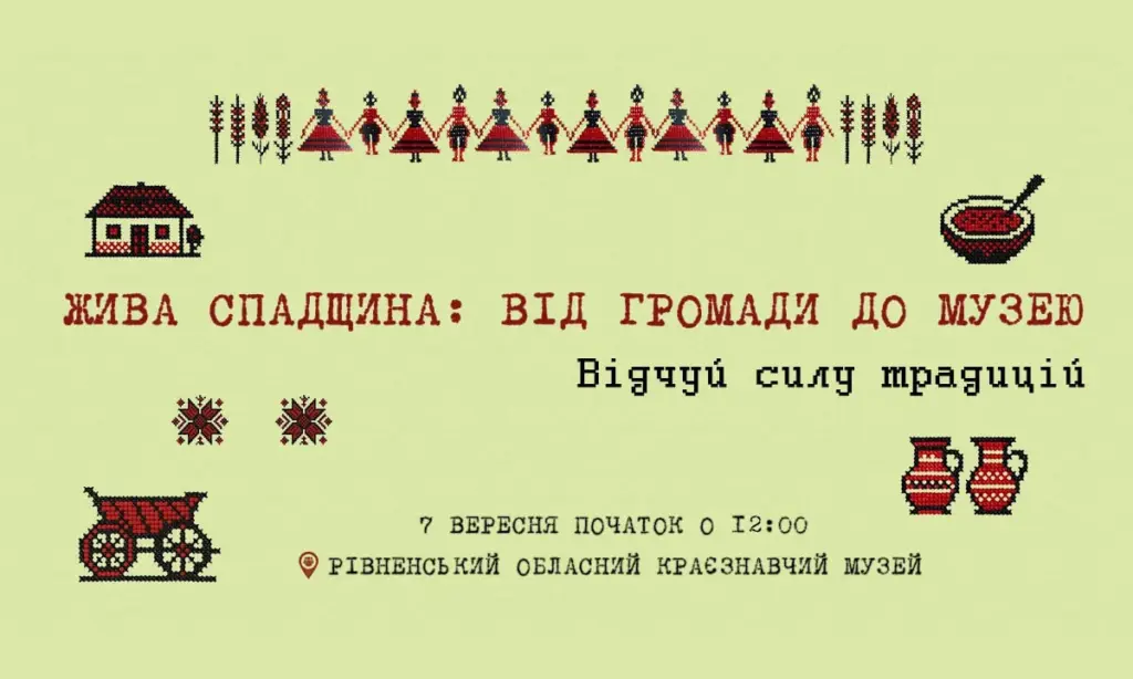 7 вересня о 12:00 подвір’я Рівненського обласного краєзнавчого музею перетвориться на справжній осередок традицій, пам’яті та теплого єднання. Тут відбудеться улюблений культурний захід «Жива спадщина: від громади до музею» – щорічна подія, яка з кожним роком стає дедалі більшою і значущою для мешканців області.