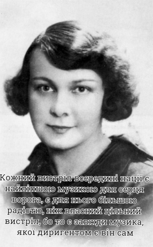 Але ось без таких, як Олена Теліга, іншою була б Україна. Не було б волі, пісень, або не було б її взагалі. Наша історія – як мозаїка, що складається з різнокольорових камінців. Різного розміру і різного кольору. Серед них так багато чорного і червоного – горя і крові, що були переважними в якісь часи. Ось, як тепер, вже давно з 2014 року.А скільки було до того! Були запеклі, обнадійливі 1922-24 роки. Ці часи мали так багато сильних, талановитих, яскравих, теж люблячих свою країну людей. Вони залишили по собі українську культуру, прагнення до самостійності, свобідного волевиявлення, бажання жити в мирі й з миром. Це вони нам залишили. Але така вже доля нашої України, що знову маємо час жорстокої війни за неї. Практично за її фізичне існування. Та жоден українець нині не сумнівається в Перемозі, до якої безсумнівно долучилася тоді, в далекому лютому 1942 року, Олена Теліга.