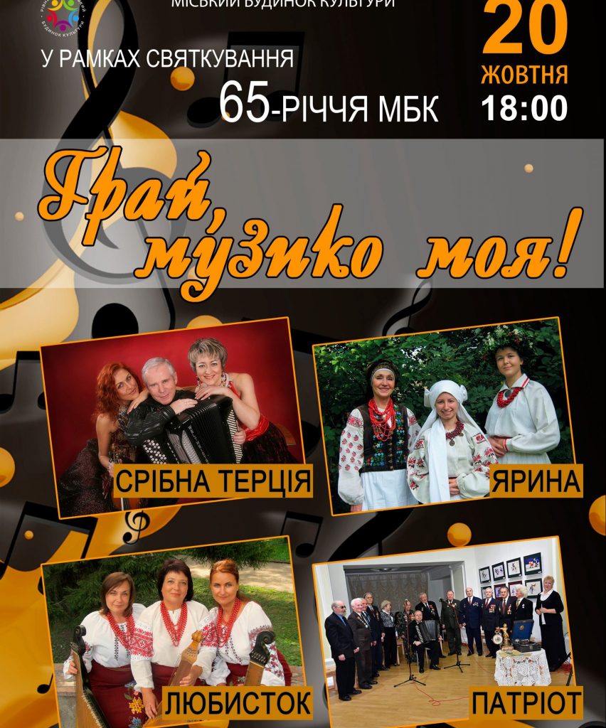 Продовжується святкування Дня народження Міського Будинку Культури Рівного. Одразу чотири імениті колективи заспівають в один день зі сцени МБК. Концертна програма матиме назву “Грай, музико моя!”