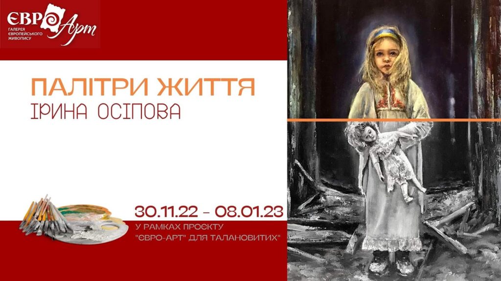 Персональна виставка Ірини Осіпової «ПАЛІТРИ ЖИТТЯ” триватиме з 30 листопада 2022 року по 8 січня 2023 року.
