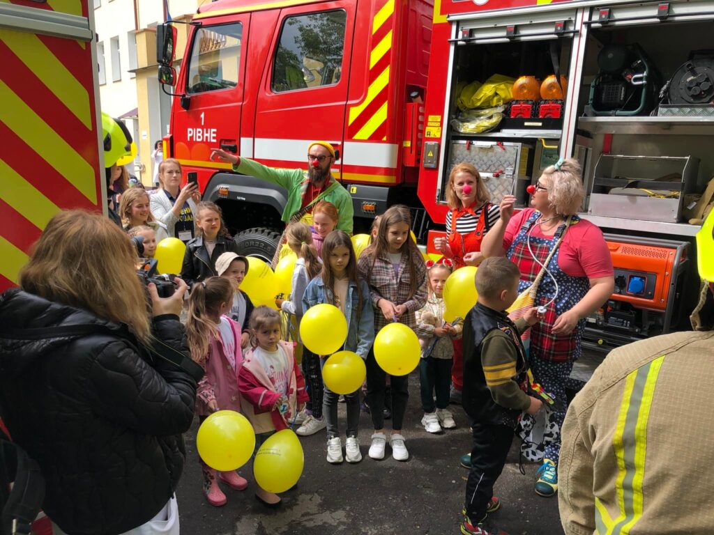 Команда лікарняних клоунів як і щороку теж долучилася до святкової феєрії: разом з дітьми вчили правила дорожнього руху, робили бульбашкове шоу, бешкетували, гралися, змагалися, робили аквагрим і навіть злива не завадила веселощам.