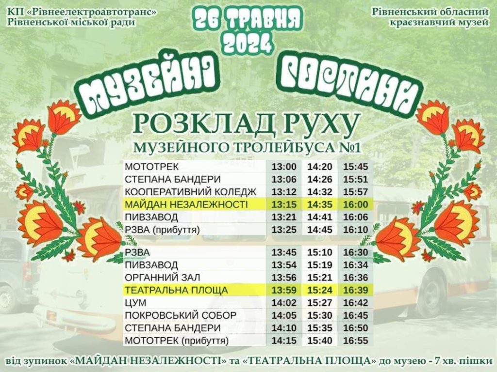 Крім того, за замовленням музею під час “Музейних гостин” за історичним першим маршрутом “Мототрек-РЗВА” курсуватиме чинний експонат — Перший Тролейбус Рівного, безплатно для всіх пасажирів.