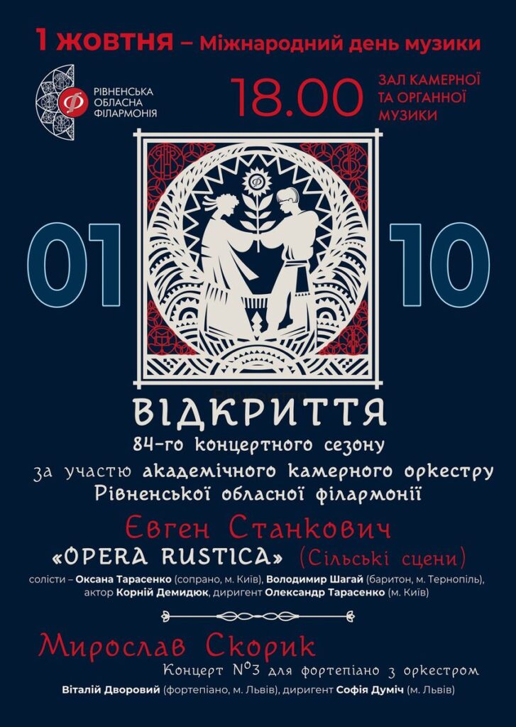Завтра, 1 жовтня Рівненська філармонія запрошує на відкриття 84-й концертного сезону. У програмі заходу: Євген Станкович «OPERA RUSTICA» та Мирослав Скорик Концерт для фортепіано з оркестром №3.