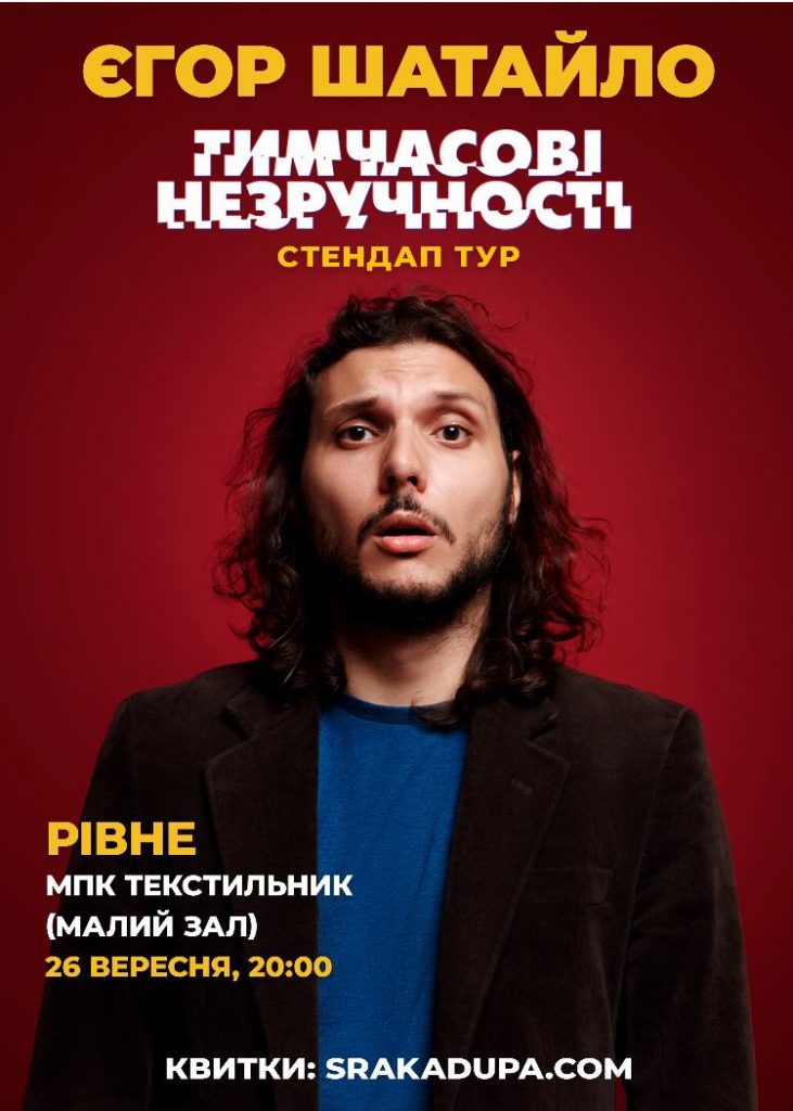 Єгор Шатайло – стендап-комік, сценарист «Телебачення Торонто», співведучий комедійного шоу Гомін Аут на Радіо Промінь та просто людина яка знає на пам’ять 3000 кодів на Сєгу Мегадрайв, вирушає в стендап тур під назвою «Тимчасові Незручності».