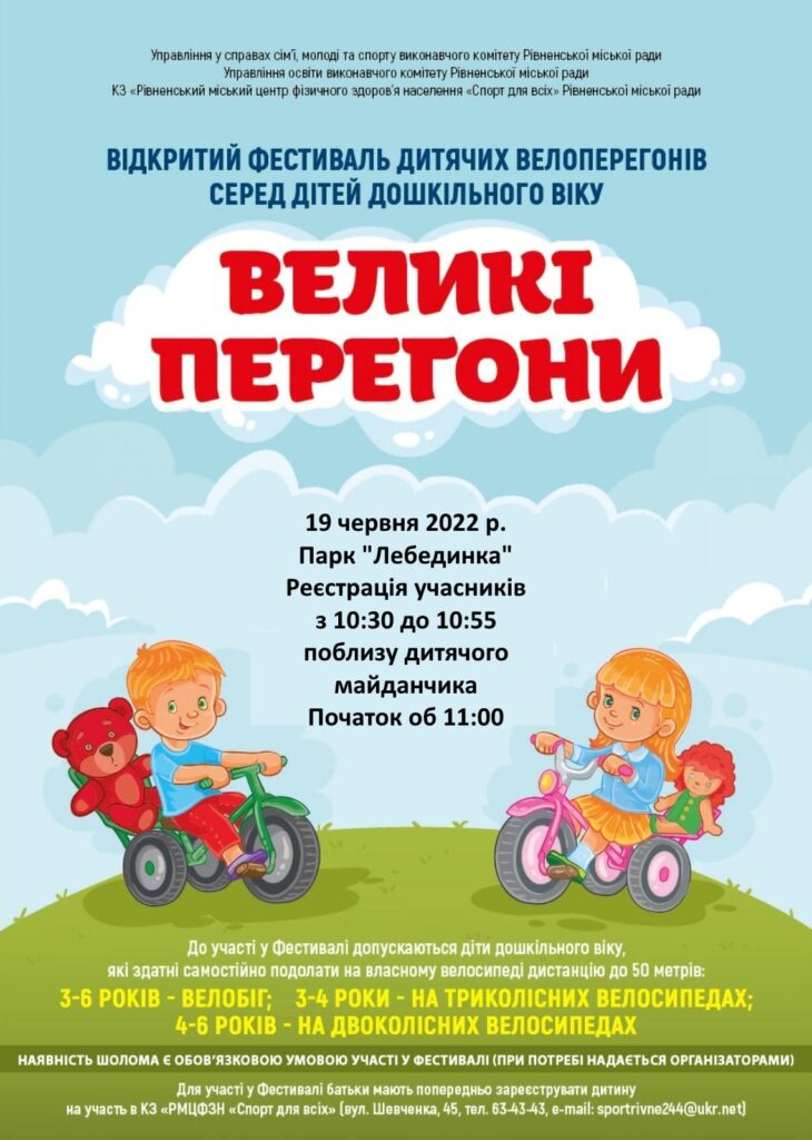 У неділю, 19 червня, в парку “Лебединка” (поблизу дитячого майданчика) відбудеться відкритий фестиваль дитячих велоперегонів серед дітей дошкільного віку “великі перегони”.