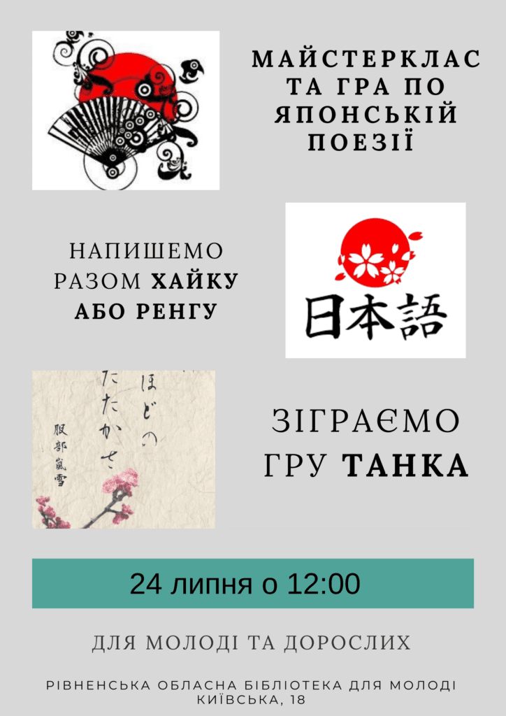 “Поговоримо про японську культуру та історію японської поезії, буде майстерклас з написання хайку (розглянемо основні принципи написання хайку та спробуємо їх написати) та гра поетичні карти по середньовічній японській поезії танка. При бажанні можемо всі разом написати ренгу (колективний японський твір). Учасники можуть підготуватись до гри, взявши в нашій бібліотеці книгу «Японська класична поезія» (в читальному залі)”, — йдеться у повідомленні організаторів.