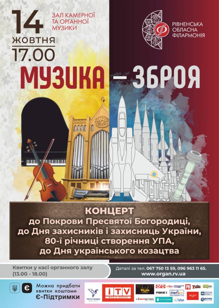 У Ріненському залі органної музики відбудеться концерт до Дня захисників і захисниць України, 80-річчя УПА і Дня козацтва. Назва заходу: “Музика – зброя”.