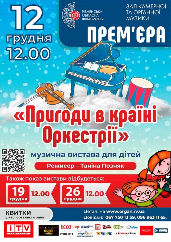 12 грудня о 12 годині в залі камерної та органної музики Рівненської обласної філармонії відбудеться прем`єра музичної вистави для дітей “Пригоди в країні Оркестрії”.