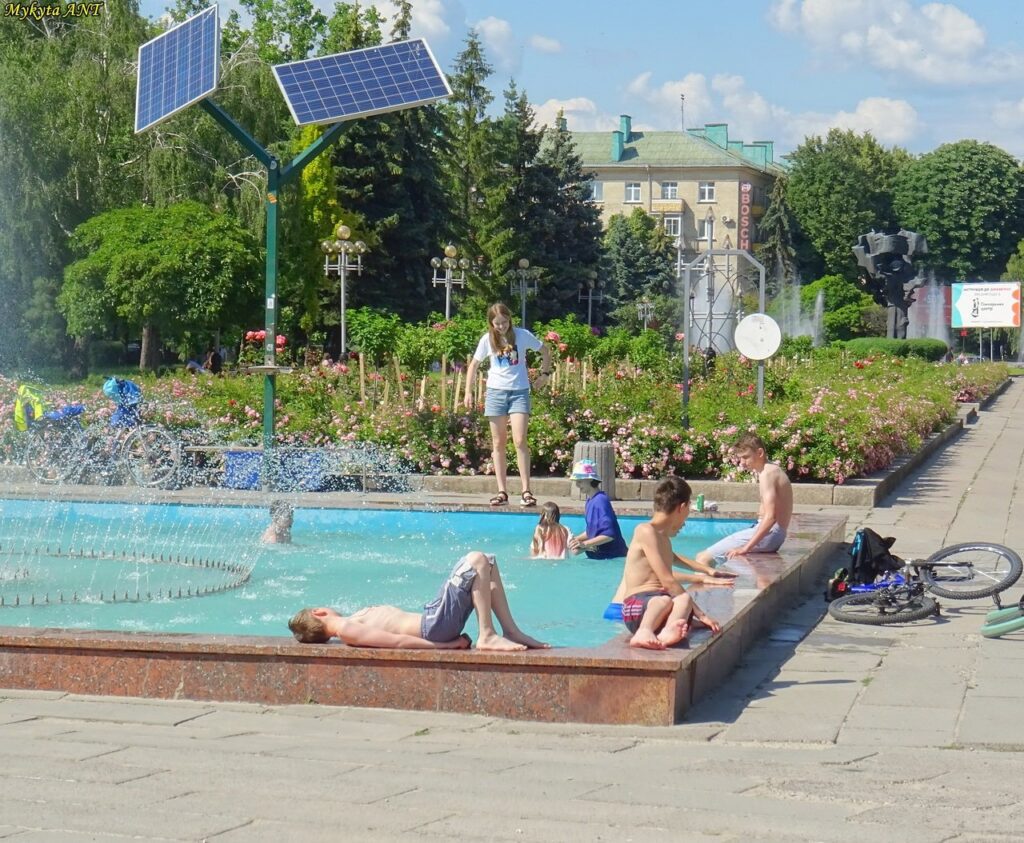 Тридцятиградусна спека загнала деяких рівнян у фонтан. Хлопці, і навіть мама з дитиною, влаштували водні забавки у штучній водоймі за кінотеатром “Україна.
