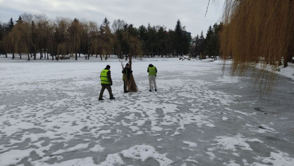 Працівники КП Рівненський міський трест зеленого господарства зробили лунки на Лебединці для риби, так як товщина льоду дозволила вийти на озеро.