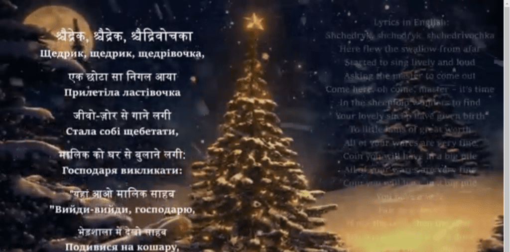 Колядку на гінді виконали Аліна Долгополова, Христина Мазумдер та Олена Зиміна. Ідея, адаптація тексту та відеомонтаж належать Марині Акрам.