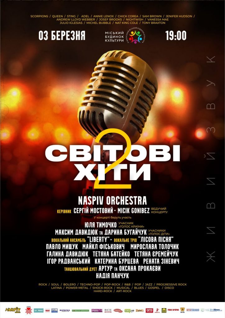 Отож оновлена концертна програма «Світові хіти» відбудеться 3 березня о 19 год у Міському Будинку Культури.