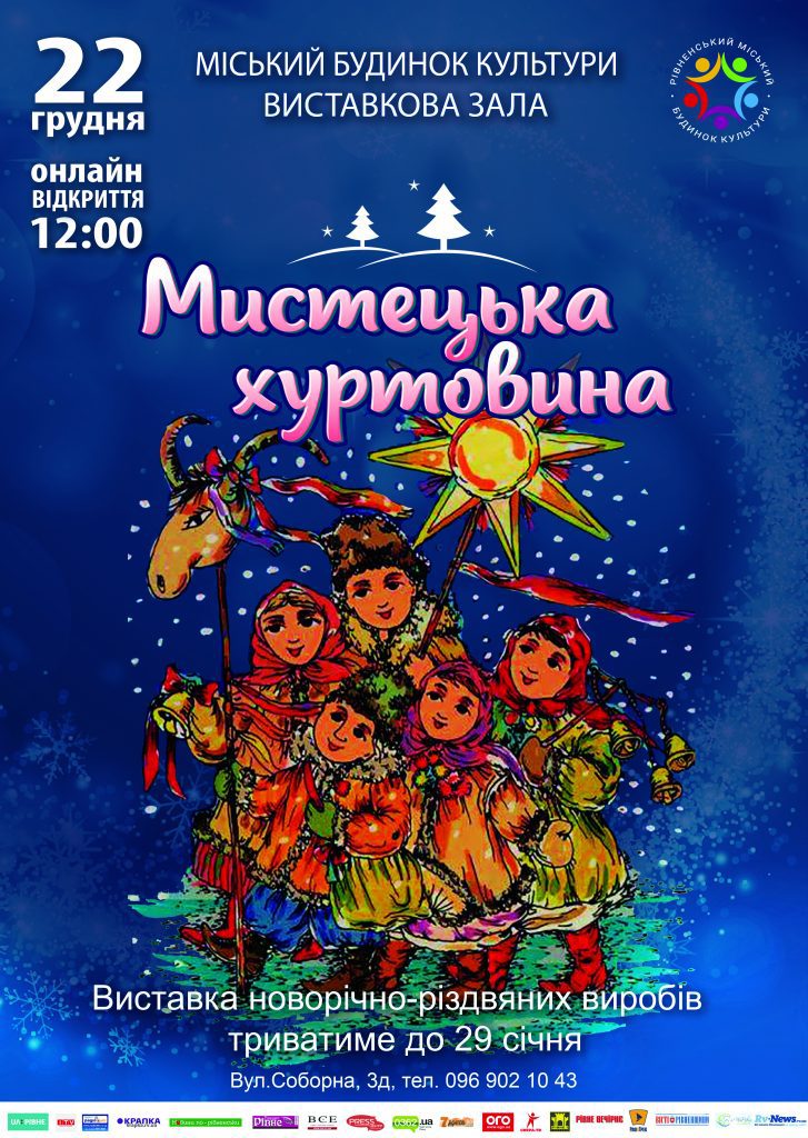 «Мистецька хуртовина» – це щорічний виставковий проєкт Міського Будинку Культури та студії майстрів декоративно-ужиткового мистецтва. Митці готуються до нього протягом року, щоб занурити усіх у дивосвіт рукотворних художніх виробів та справжню новорічну казку. Тут ви завжди маєте можливість побачити силу-силенну святкової атрибутики, ялинкових прикрас, надихнутись ідеєю створення власного різдвяного декору і навіть обрати подарунок близьким прямісінько з експозиції! Кераміка, текстиль, метал, декупаж, соломоплетіння, вишивка і ще багато технік від більш як десятка майстрів будуть представлені вашій увазі цього разу. Тематика цьогорічної «Мистецької хуртовини» – мотиви колядок. Ця виставка – одна суцільна вражаюча різдвяна фотозона, тому беріть друзів і приходьте! Вхід вільний (з дотриманням карантинних вимог).