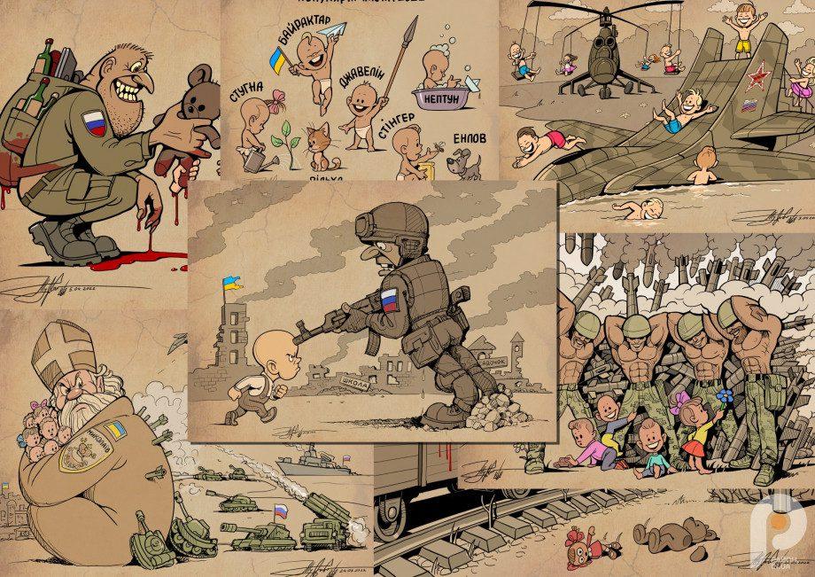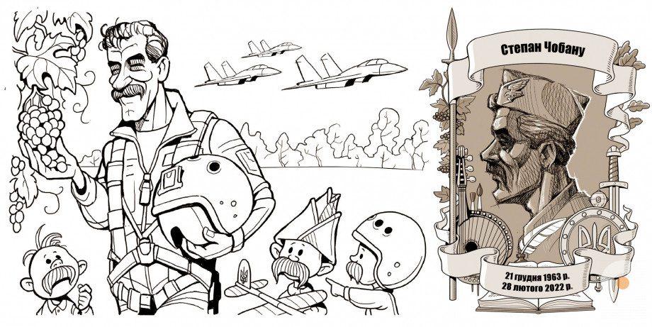 «Сьогодні я намалював Степана Івановича Чобану. Він українець молдавського походження. Загинув 28 лютого 2022 року. Я про нього взагалі нічого не знав. В інтернеті було два фото Степана Чобану. І лише в ютубі я знайшов коментар, що він любив підрізати виноград в альтанці біля аеропорту. Тому так його і зобразив. Знайомий з «Привидами Києва» і з командуванням Повітряних сил «Центр». Я їх спонукаю до того, щоб в українській армії, як-от в американській, з’явилася якась традиція. Приміром, щоб всі пілоти до якогось дня відрощували собі вуса. Було б класно, якби вони робили це до дня народження Чобану. Пам’ятники і вулиці – це добре, але цікаві традиції додають історичного драйву», – розповів Юрій про одного з героїв наступного календаря. А от малюнки про наше сьогодення, які Юрій Журавель творить як хронологію війни, увійдуть до книги «Сториця».