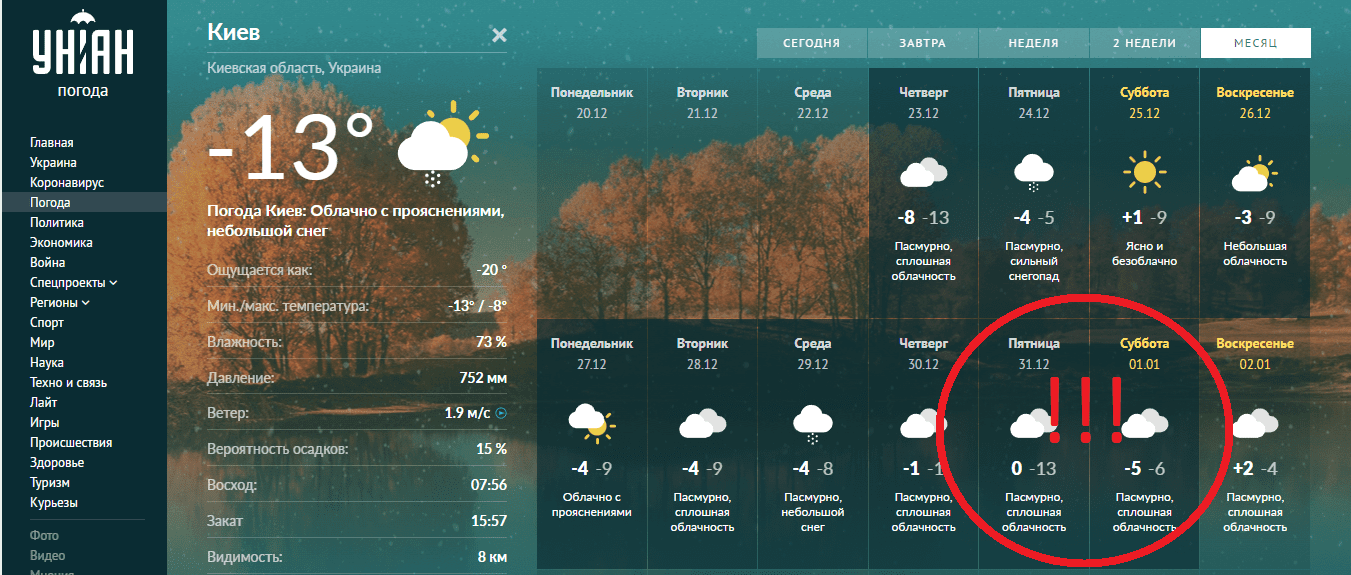 Звичайно ми розуміємо, що наразі найактуальнішою новиною є «Прогноз погоди на Новий Рік», «Якою буде погода у новорічну ніч», «Чи буде сніг на Новий Рік» і так далі. Сайт з новинами посилається на дані «Погода УНІАН». І знову ж таки, нагадуємо, що на жодних подібних сайтах немає даних від синоптиків, це просто представлені розрахункові дані однієї якоїсь моделі.