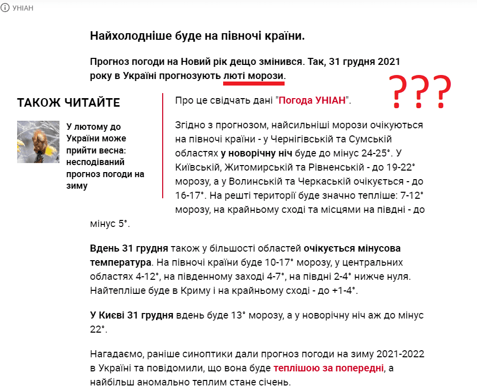 До того ж, для порівняння невідповідності тексту додаємо також скрін сайту «Погода УНІАН», де чітко видно розбіжність в тому, що написано в тексті і в тому, що на їх власному сайті. Виходить, що не такі вже і морози, так УНІАН? І даною новиною ви протирічите самі собі?