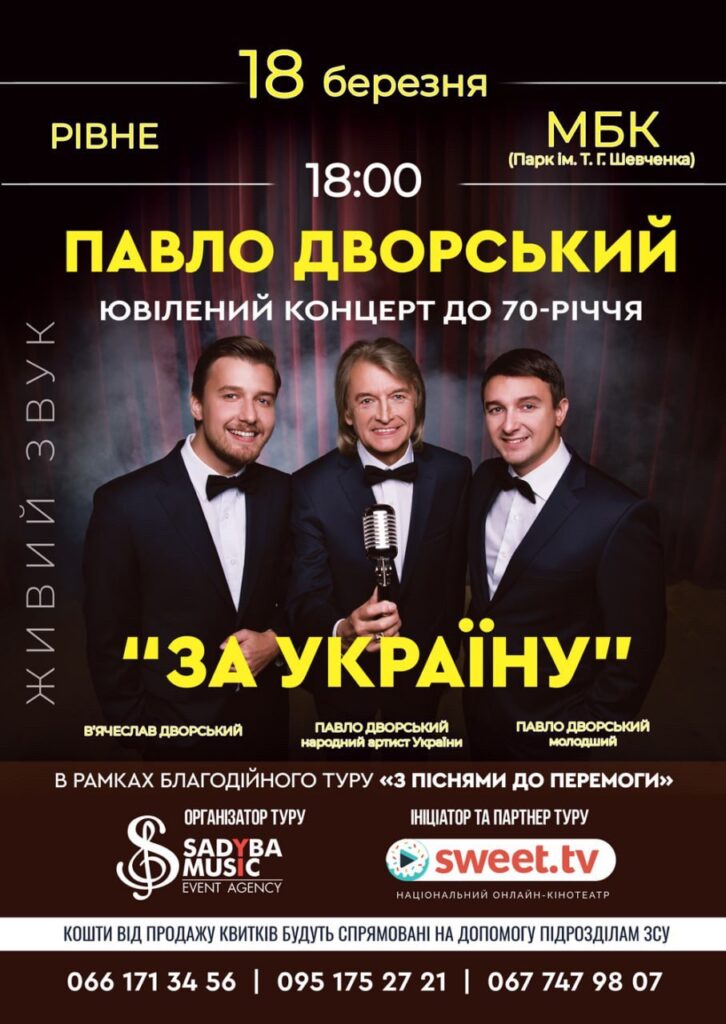 Ювілейні концерти Павла Дворського «За Україну» на Рівненщині це третя хвиля виступів улюблених артистів у благодійному турі містами України «З піснями до перемоги» за підтримки SWEET.TV. Кошти від продажу квитків підуть на закупівлю необхідних речей, гаджетів і устаткування для наших мужніх ЗСУ.