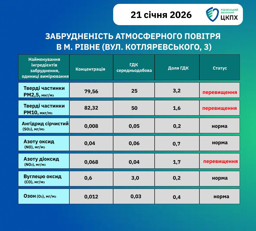 Зокрема, вміст твердих часток PM10 перевищує норму у 1,6 раза (82,32 мкг/м³), PM2,5 – у 3,2 раза (79,56 мкг/м³), а рівень діоксиду азоту – у 1,7 раза (0,068 мкг/м³).