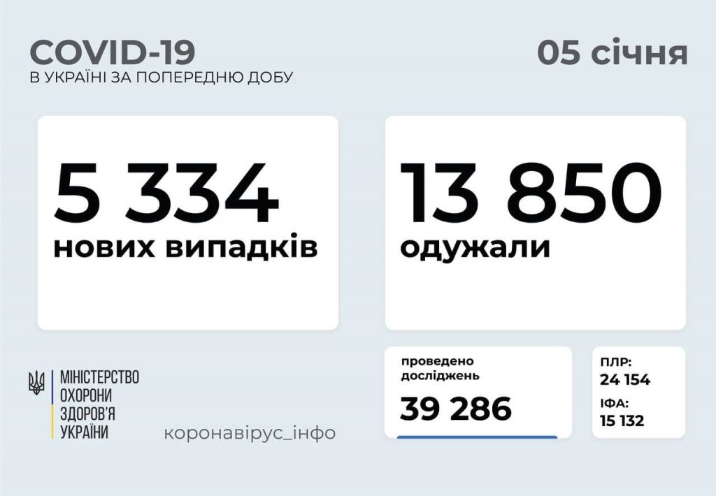 5 334 нових випадки коронавірусної хвороби COVID-19 зафіксовано в Україні станом на 5 січня 2021 року. Зокрема, захворіли 164 дитини та 362 медпрацівники.