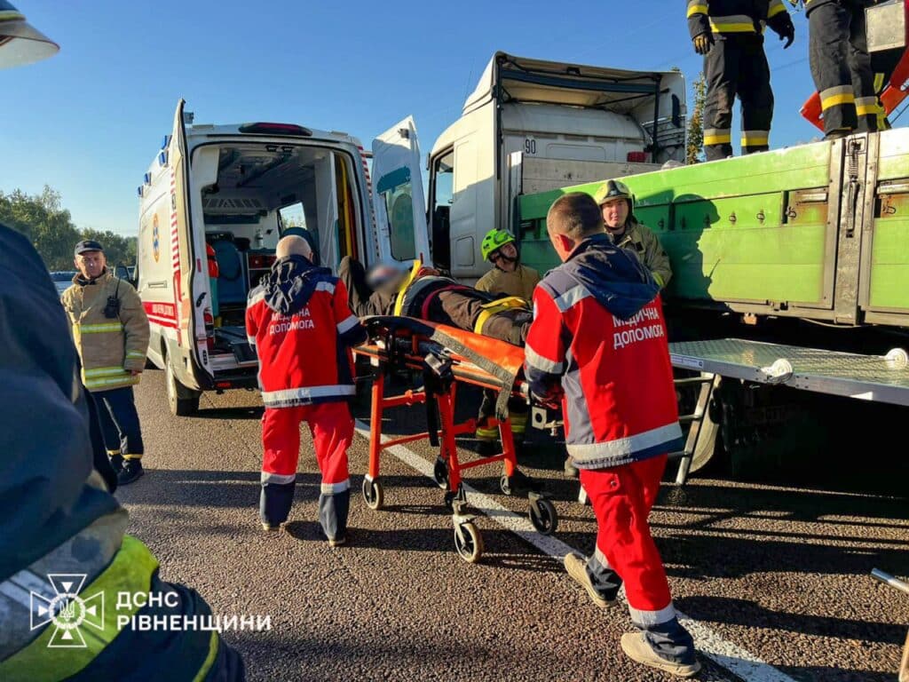 У результаті зіткнення в кабіні вантажівки DAF опинився затиснутим водій. Рятувальники за допомогою спеціального обладнання деблокували постраждалого та передали його медикам.
