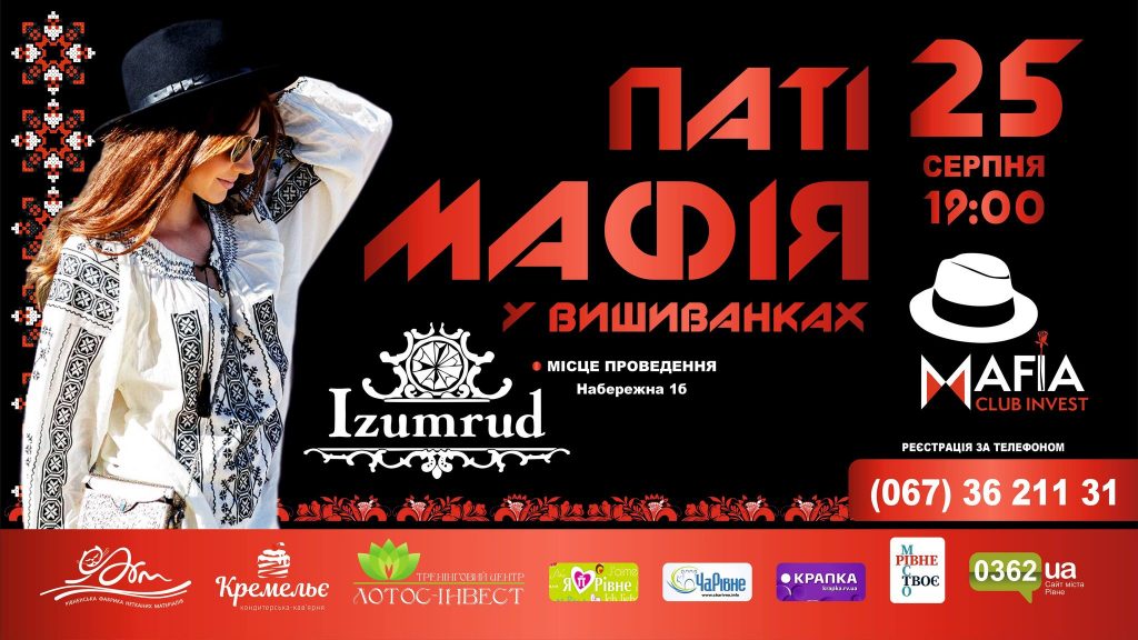 На честь Дня Незалежності України у місті Рівне проходитиме мафіозна вечірка у вишиванках.