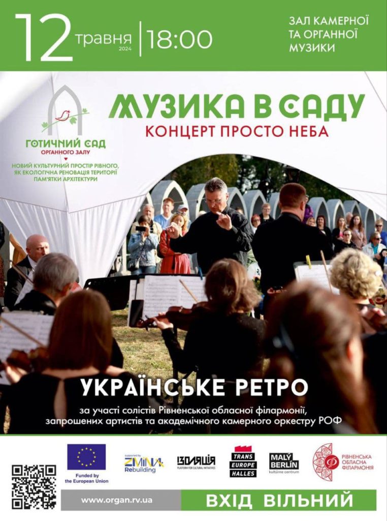 Проєкт “Готичний сад Органного залу — новий культурний простір Рівного як екологічна реновація території пам’ятки архітектури” реалізується КЗ “Рівненська обласна філармонія” РОР в рамках програми ZMINA: Rebuilding, за підтримки фонду ІЗОЛЯЦІЯ (UA), Trans Europe Halles (SE), Malý Berlín (SK) та співфінансується програмою Європейського Союзу “Креативна Європа”.