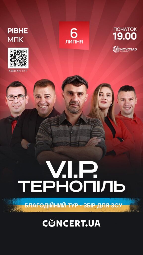 На рівнян чекає незабутня зустріч з улюбленими героями скетчкому «Країна У» та сіткому «Одного разу під Полтавою», серіалу «Готель Галіція» і чимало ексклюзивчиків. Одна з найкращих гумористичних команд України V.I.P. Тернопіль у рамках благодійного туру Україною на підтримку ЗСУ привезе у Рівне нову мегапозитивну концертну програму “Glory to Ukraine” 6 липня.
