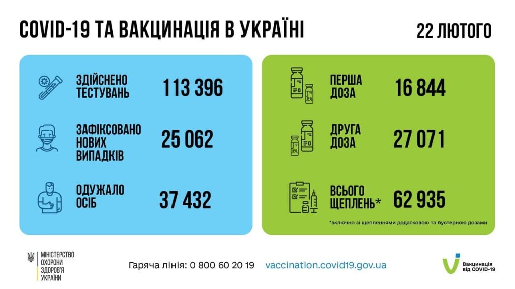 За добу 22 лютого в Україні зафіксовано 25 062 нових підтверджених випадків коронавірусної хвороби COVID-19 (з них дітей – 2 427, медпрацівників – 665).