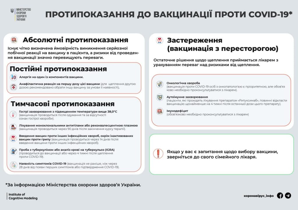 В Міністерстві (https://t.me/mozofficial) охорони здоров’я України підготували інфографіку щодо протипоказань до вакцинації проти COVID-19.