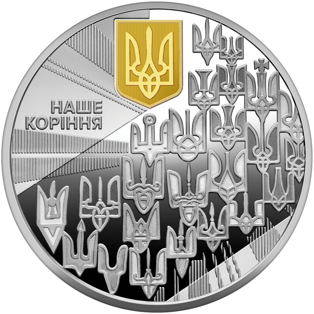Монета «Наш герб» присвячена тризубу як знаку Княжої Держави Володимира Великого. Вона демонструє еволюцію символу — від княжих знаків Святослава Хороброго до сучасного Державного Герба, уособлюючи спадковість, духовну єдність і прагнення до свободи.