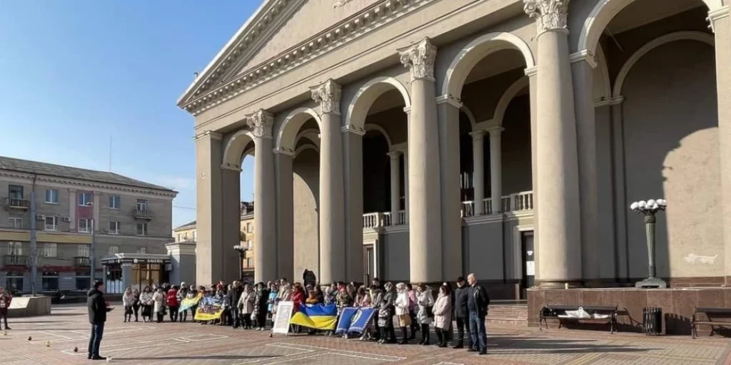 Акція пройшла біля драмтеатру. Серед учасників акції, вимушені переселенці, зокрема представники громадської організації «Я – Маріуполь».