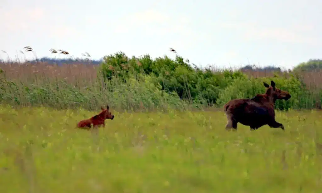 У Нобельському парку, що на Рівненщині, поповнення. На його території вдалося зафіксувати зворушливу сцену – лосицю з дитинчам. Воно постійно бігає за мамою.