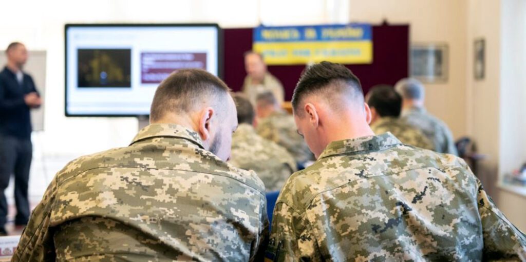 Фото: Двоє українських військових капеланів у класі під час навчання, яке проводять британські військові (Міністерство оборони Британії).
