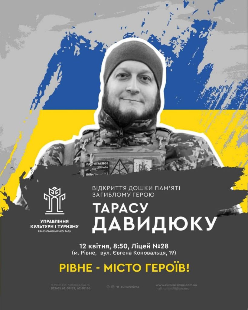 12 квітня о 08:50 на фасаді ліцею №28 відбудеться відкриття дошки пам’яті загиблому Герою Тарасу Давидюку