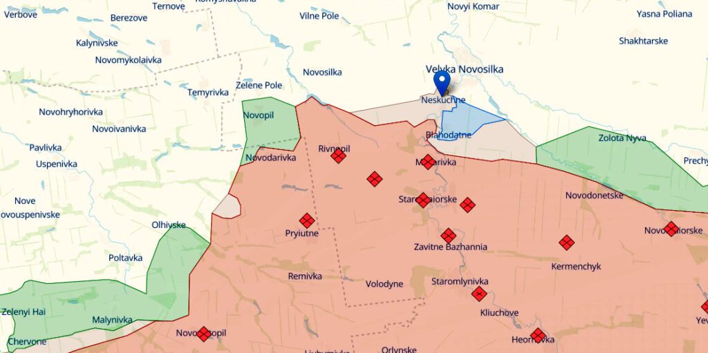 “10 червня 2023 року 7-й окремий батальйон “АРЕЙ” Української Добровольчої Армії 129-ї оБр сил Територіальної Оборони ЗСУ під командуванням майора Грищука Олександра, Друга “МАКЕДОНЦЯ” звільнив село Нескучне Великоновосілківської селищної громади Волноваського району Донецької області. Слава Україні”, – йдеться у повідомленні.