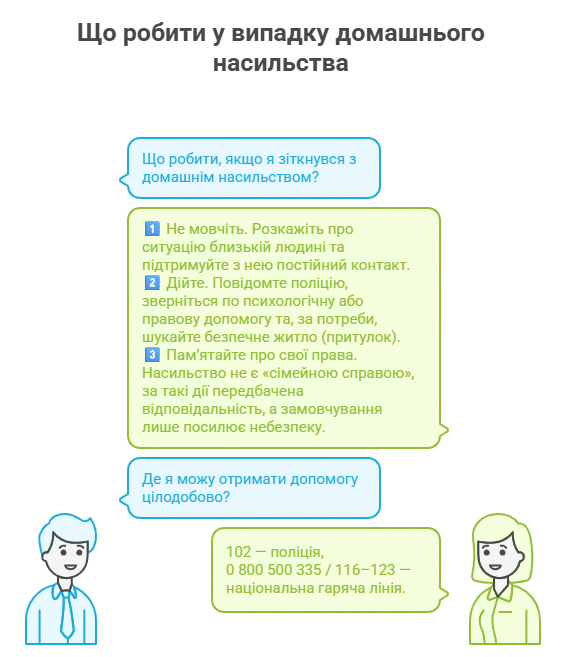 Домашнє насильство — це не особиста справа родини, а питання безпеки. У разі його вчинення необхідно повідомити поліцію, звернутися по психологічну, правову чи соціальну допомогу. За потреби важливо подбати і про безпечне місце перебування — ним може стати спеціалізований притулок або інше альтернативне житло.