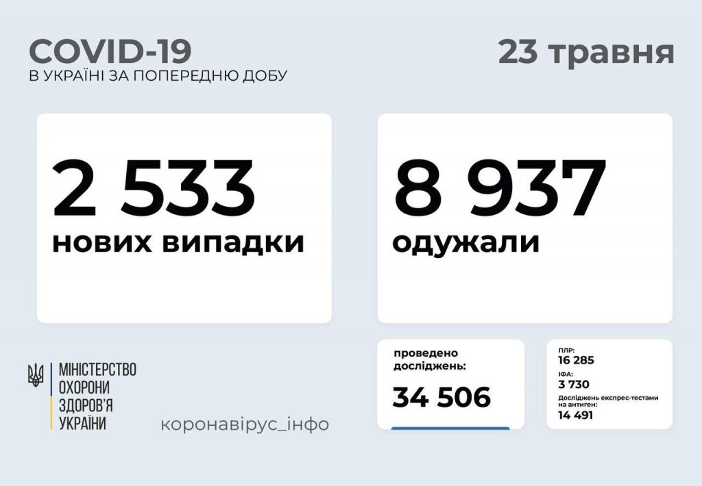 2 533 нових випадки коронавірусної хвороби COVID-19 зафіксовано в Україні станом на 23 травня 2021 року.