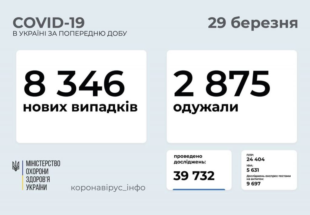 8 346 нових випадків коронавірусної хвороби COVID-19 зафіксовано в Україні станом на 29 березня 2021 року. Зокрема, захворіли 344 дитини та 140 медпрацівників.