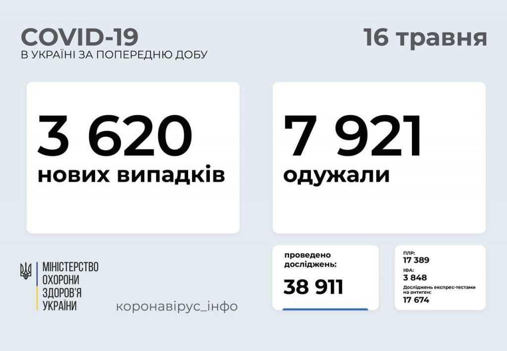 3 620 нових випадків коронавірусної хвороби COVID-19 зафіксовано в Україні станом на 16 травня 2021 року.